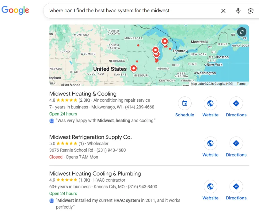 This is an example of a typcial customer search request. In this case, the customer is looking for the "Best HVAC system in the MidWest".